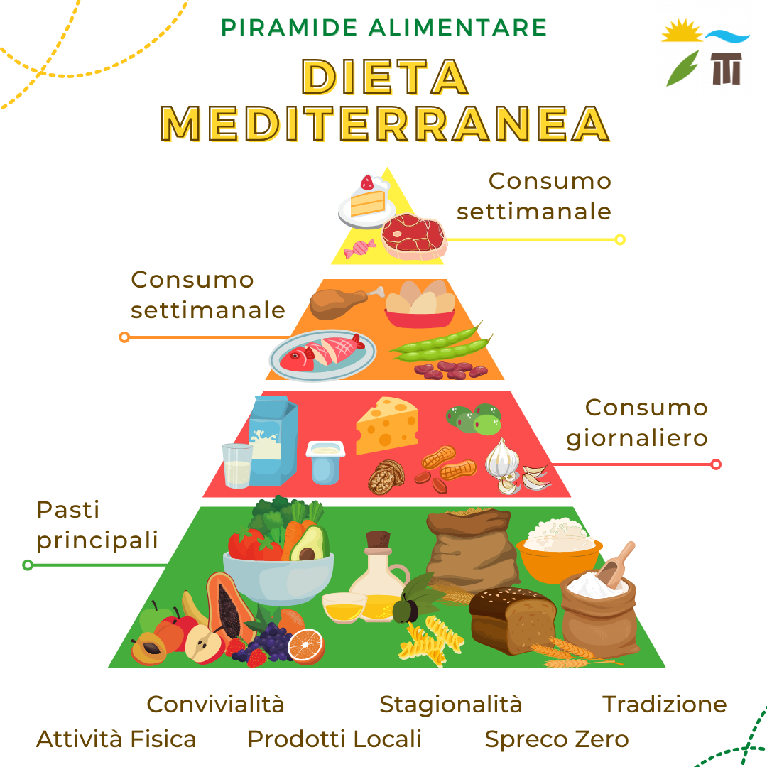 La Dieta Mediterranea è caratterizzata da un modello nutrizionale rimasto costante nel tempo e nello spazio, costituito principalmente da olio di oliva, cereali, frutta fresca o secca, verdure, una moderata quantità di pesce, latticini e carne, e molti condimenti e spezie, il tutto accompagnato da vino o infusi, sempre nel rispetto delle tradizioni di ogni comunità.